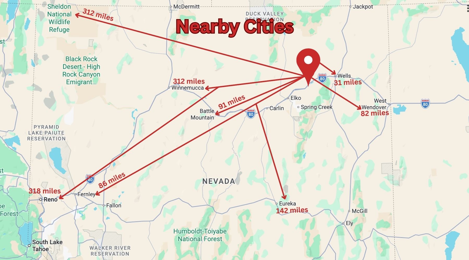 Elko is the main town just minutes away for food, gas, and supplies. Salt Lake City is about 2.5 hours away by car, making bigger shopping trips or travel simple.